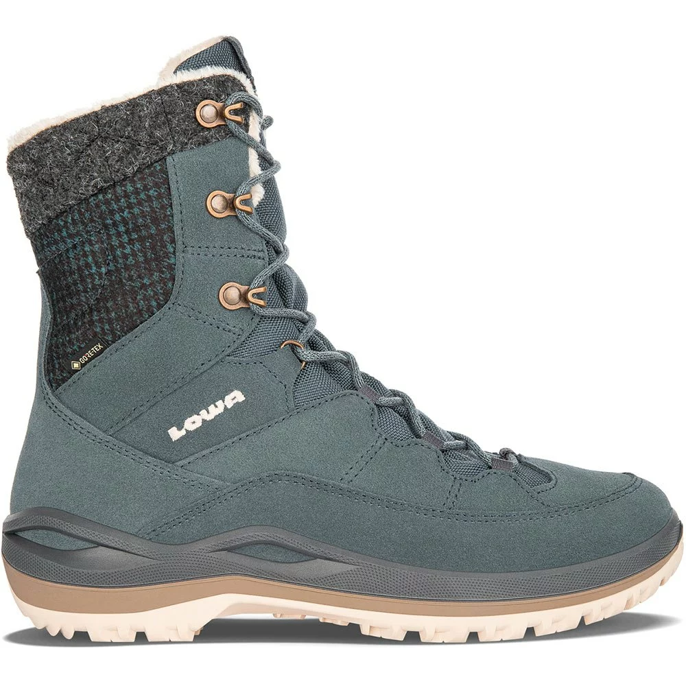 Mit langweiligen klassischen Winterstiefeln haben die LOWA Calceta III GTX Ws Winterstiefel nichts gemein. Sie entpuppen sich als modischer Freizeitschuh, der die Blicke auf sich zieht. Diese auffallenden Eigenschaften werden durch die dezente Farbpalette des Schuhwerks und vor allem durch sein gestalterisches Gesamtkonzept erzeugt. Alles beginnt mit dem leicht getrimmten Obermaterial und reicht bis zu den trendigen Stoffelementen und dem farblich abgestimmten LOWA Monowrap Rahmen. Der Mid Cut Damenstiefel überzeugt nicht nur durch sein Design, sondern auch durch seine funktionalen Details. Die Kombination aus robustem Vollnarbenleder mit einem weichen und extra warmen Gore Tex Partelana Futter, einem Materialmix aus Loden und Leder und einer dämpfenden Laufsohle mit solidem Grip sorgt für hervorragenden Tragekomfort bei jedem Wetter. In Einkaufsstraßen, auf Weihnachtsmärkten oder bei Spaziergängen durch verschneite Landschaften kommen die perfekten Qualitäten der Stiefel gleichermaßen zur Geltung. Entworfen für einen Damenfuß und für zusätzlichen Komfort auf einem Damenleisten aufgebaut. 100% wasserdicht und atmungsaktiv.